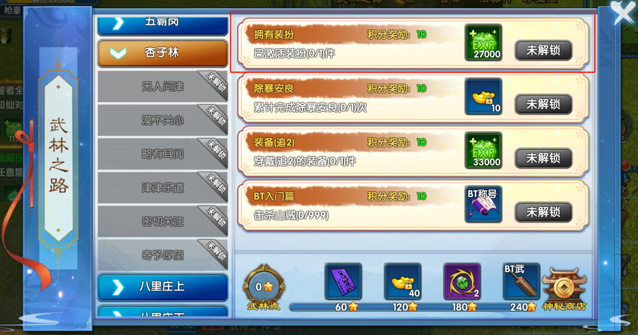 当某一地图阶段任务完成后,不仅累积的武林点可以领取对应奖励,还有神秘商店提供成长必备道具,消耗一定量的金钱即可购买。